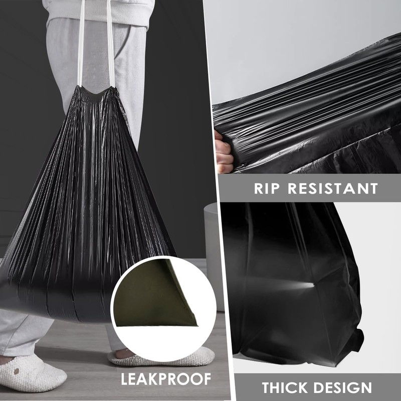 - Convenient Drawstring Handles: The strong drawstring let a tight grip on trash cans , so there is no messy bag overhang or bunching.