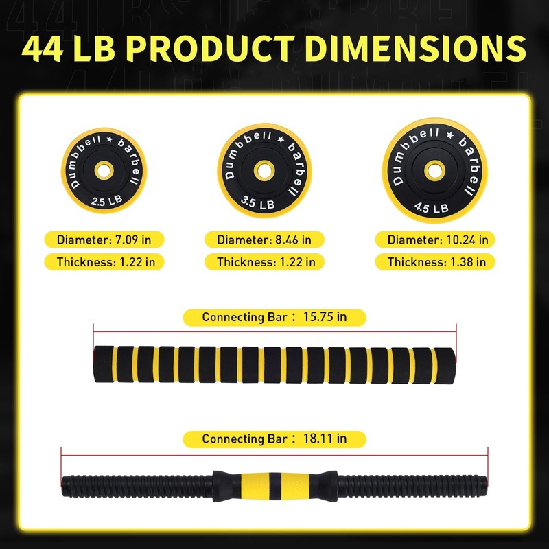 • 44 LB PACKAGE INCLUDED: 4 x 4.5 LB Dumbbell Weight Plate, 4 x 3.5 LB Dumbbell Weight Plate, 4 x 2.5 LB Dumbbell Weight Plate, 2 x Dumbbell Bars, 1 x Connecting Bar, 8 x Nuts.
