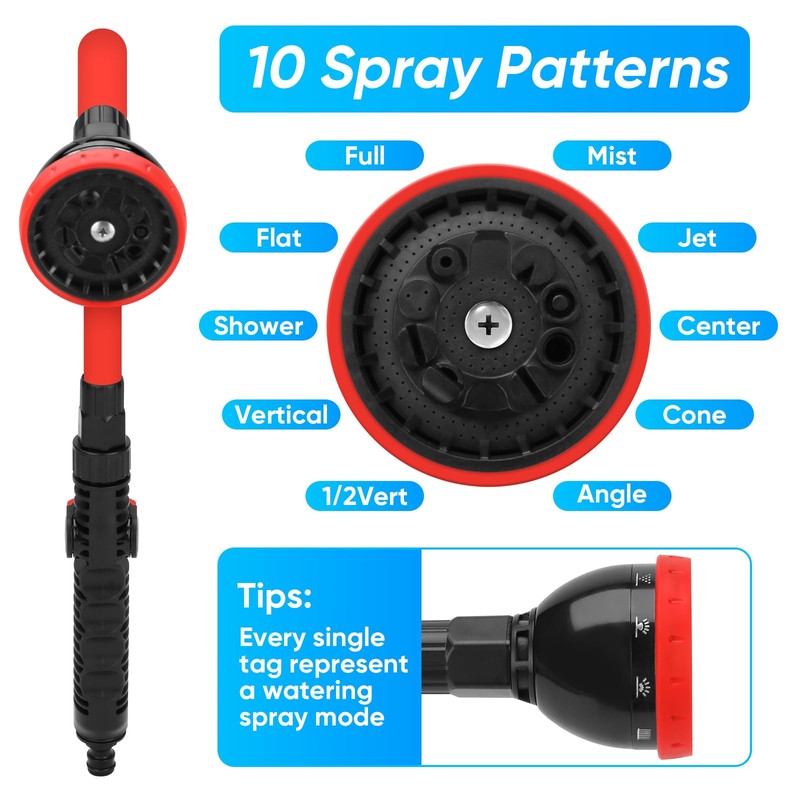 • 【10 Watering Patterns】Rotate the spray head dial to select a water pattern as you want, flat, full, mist, jet, center, cone, angle, vertical, and ½ vertical and so on. The low pressure watering wand will working correctly, widely use at outdoor. 10 watering patterns not only can be used in garden and car cleaning, but also can be used at window cleaning, if your home’s window get some dust, then you can use our product to clean it, it is also useful home cleaning tool.