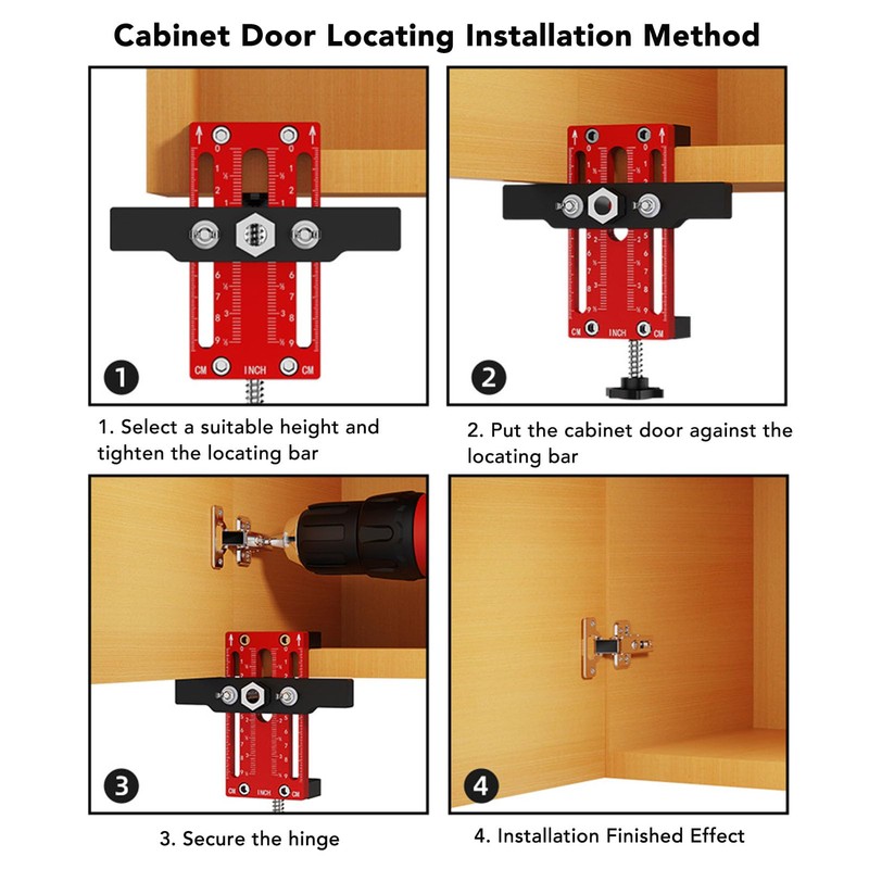 - 【Quick and Easy Setup】With sturdy aluminum support arms and clamps, this adjustable cabinet door installation jig allows you to hold the door with one hand while connecting the hinge with the other, making cabinet door installation a breeze.This cabinet door mount locator significantly reduces the time required for door installation.