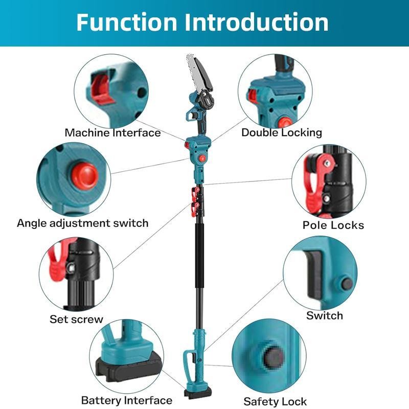 DOUBLE SAFETY LOCK: The electric pole chainsaw features a safety lock that effectively prevents accidental activation of the switch, thereby reducing potential safety hazards. More importantly, after installing the battery, the chainsaw will not start immediately; you must ensure that both the safety lock and the start button are pressed simultaneously to operate the machine. This design not only enhances operational safety but also provides a higher level of protection for you and your family.