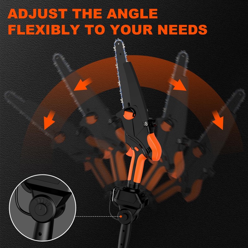 • PROFESSIONAL-GRADE TRIMMING SYSTEM: Conquer hard-to-reach branches with multiple angles adjustments (0°-135°) – functions as both electric pruning saw for delicate cuts and electric saw for tree branches for thick limbs. In addition, Cordless electric chainsaw operation eliminates fumes while battery powered chain saw mobility excels in orchards/greenhouses. Includes extension pole for tree pole saw versatility.
