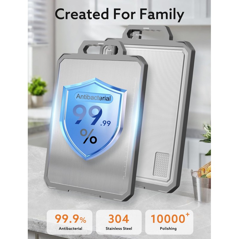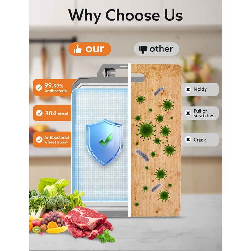 - 2-in-1 Cutting Board & 100% BPA-Free Durable Material :One side is made of food-grade 304 stainless steel, perfect for cutting meats, while the other side is crafted from wheat straw PP material, ideal for chopping vegetables and fruits. Unlike traditional wooden or bamboo boards, our design does not absorb moisture or odors, ensuring a more hygienic cooking experience. With 100% BPA-free materials, it’s safer for daily use, making kitchen environment better.