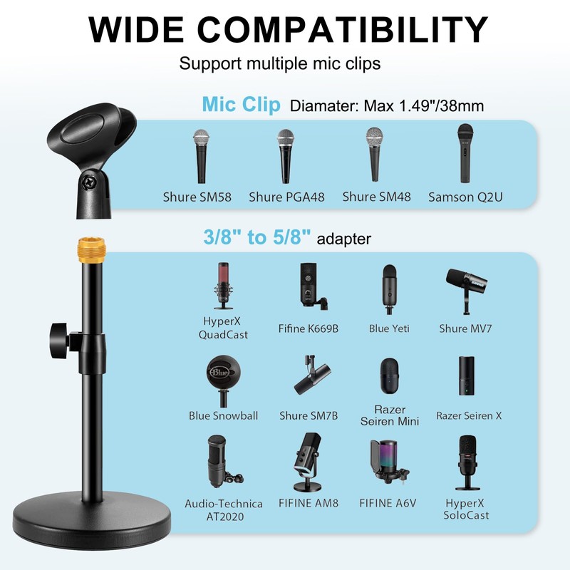 - [Strong Compatibility] With a 3/8" to 5/8" adapter, the desk mic stand is compatible with Blue Yeti, Blue Yeti Pro, Blue Snowball, HyperX QuadCast, SoloCast, Fifine, AT2020, Razer Seiren X, and other microphones. The package also comes with a mic clip with a max diameter of 1.49", compatible with dynamic microphones such as Shure SM58, Shure SM48, Samson Q2U, Shure PGA48, etc.