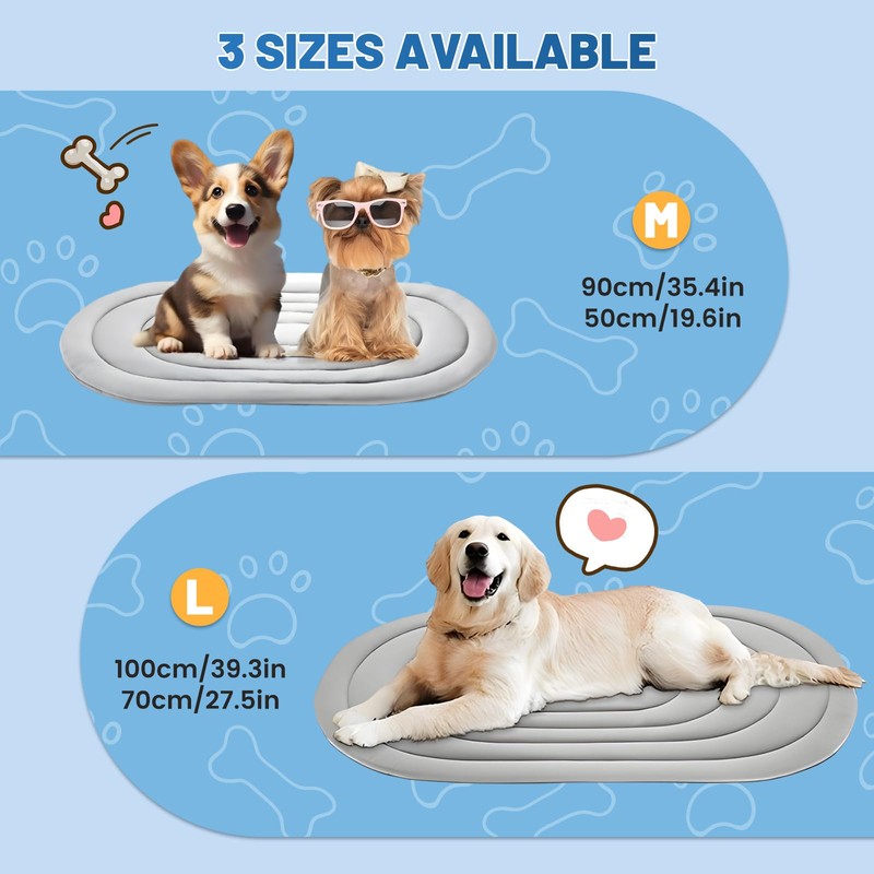 - PET COOLING PAD : Our pet cooling pad, meauring 90×50cm / 100×70cm, can naturally absorb body heat to keep your pet comfortably cool all summer long. Made of breathable cooling nylon, it enhances airflow and maintains a consistently refreshing surface without requiring electricity, refrigeration, or messy ice packs.