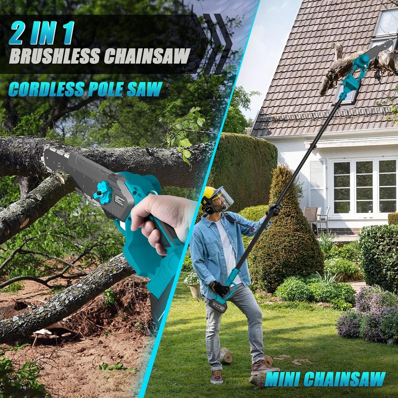 - Versatile 2-in-1 Design: The removable chainsaw head can be used as an 8-inch chainsaw or mounted on an extendable pole. It can be converted into a mini handheld chainsaw and pole saw without any tools, not only perfectly trimming high branches, but also using the mini electric saw for ground-level cutting. It can meet all your cutting needs
