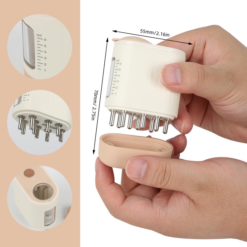 - IPX5 Waterproof with High Vibration: The scalp massager for hair growth is equipped with a 6ml storage box and marked with a clear scale, which can accurately reach the dosage of 1 ml to avoid wasting applications. The electric head massage brush is waterproof and can be rinsed directly after use.