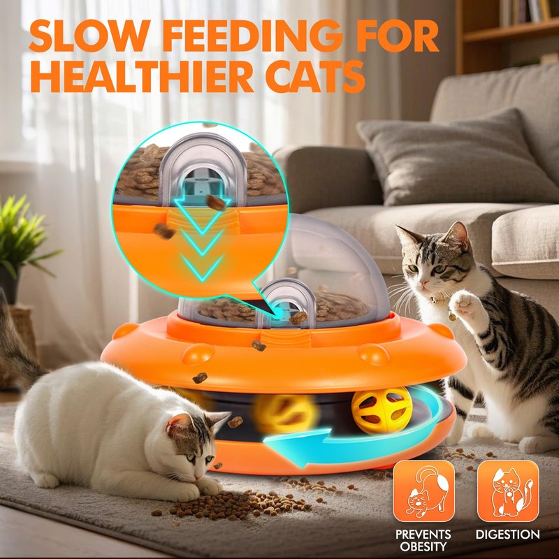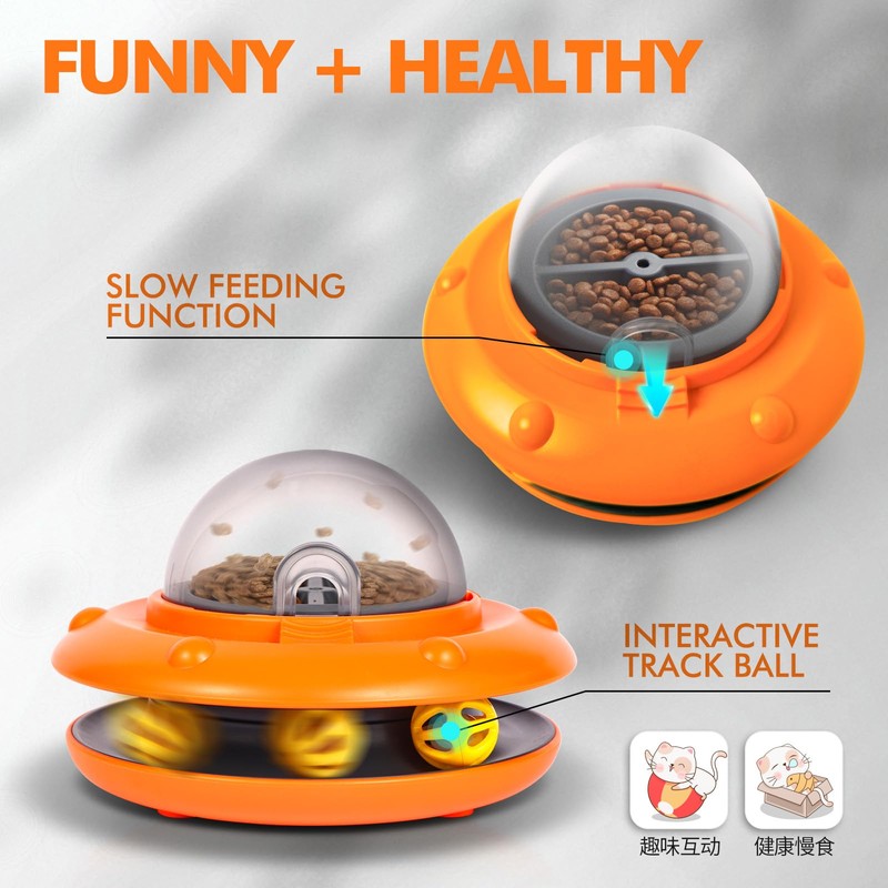 - 🚀 UFO-Shaped Cat Toy with Bell Ball for Interactive Fun Designed with a built-in ball track and bell, this cat puzzle feeder mimics natural hunting behaviors. The motion-activated food dispenser releases treats as your cat plays, keeping them entertained, mentally stimulated, and preventing boredom.