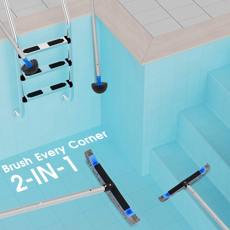 2 in 1 Multifunctional Pool Brush with 10 FT Poles - 17.5'' Heavy Duty Swimming Pool Brush & Multifunctional Brush Head, 10 FT Aluminum Poles, Cleaning Inground & Above Ground Pools, Vinyl Liner