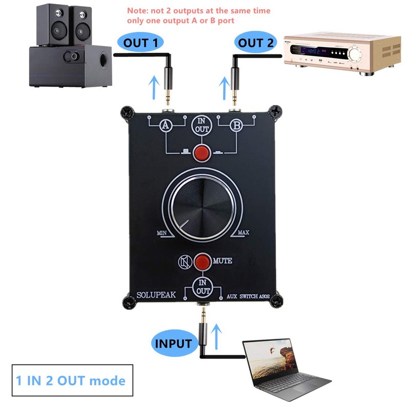 - (1-IN-2-OUT)Plug 1 audio source to input port,and 2 output connect to 2 amps(like:active speakers/headphone amp)-select audio OUT between A and B button(NOTE:not 2 amps play at same time )