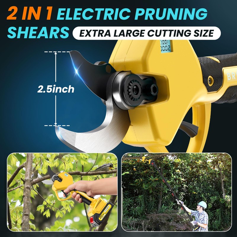 - ✅Powerful Brushless Motor: The battery pruning shears with pole feature a brushless motor for powerful; Go through tough branches in one second like butter; With less heat, noise reduction, and longer lifespan, allowing you to work with ease every time