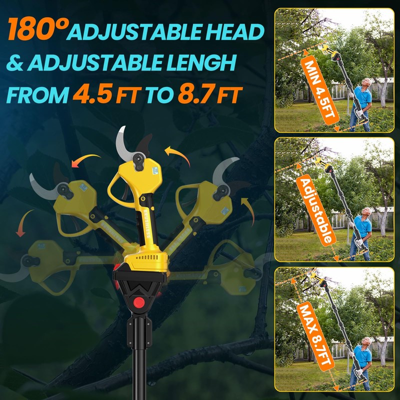 - ✅Reach Higher, Prune Confidently: The tree pruner with telescopic pole extends from 4.5ft to 8.7ft, reaching tall branches without a ladder; The 0°–180° rotating head adjusts smoothly, keeping you safe and comfortable with both feet firmly on the ground