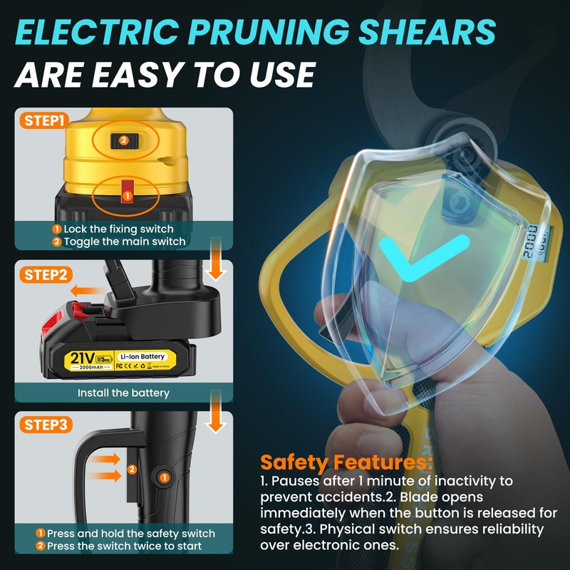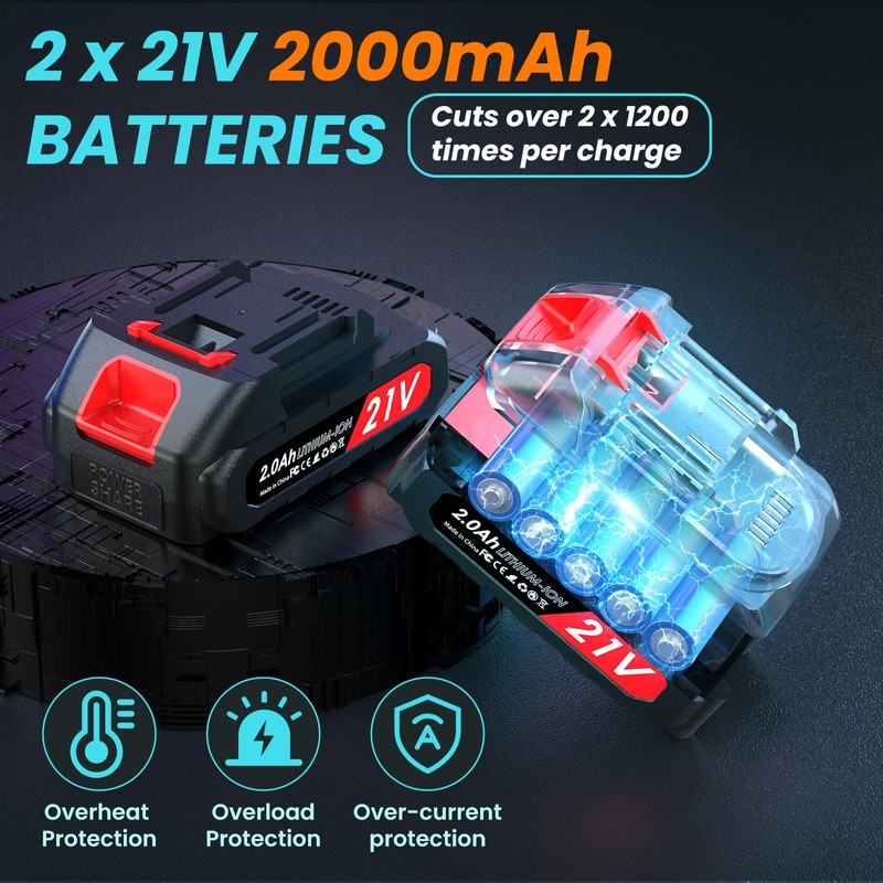 - ✅Dual Batteries, Longer Work: Powered by dual 2.0Ah batteries, this electric tree cutter delivers long runtime with 2400(2*1200) cuts per charge; Fast charging minimizes downtime, whether tending to your garden or orchard, enjoy long-lasting power for all-day pruning