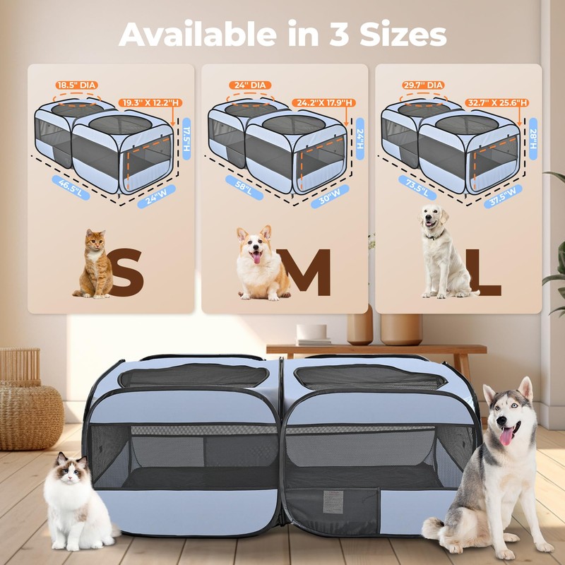 2-in-1 Pop Up Puppy Playpen, Detachable into 2 Separate Pens with Additional Doors, Assembly-Free Portable Cat Dog Crates Pet Pen Tent Kennel Kitten Enclosure Cage Indoor Outdoor Foldable Condo(L)