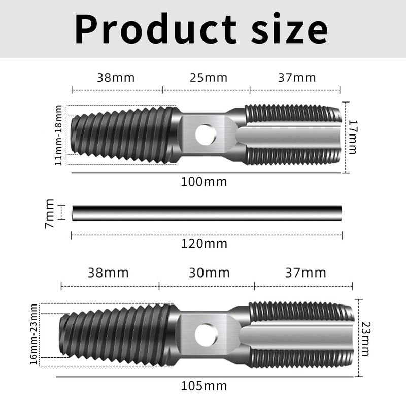 • Concrete size: the double-head screw extractor is available in two sizes to remove 1/2 inch and 3/4 inch water pipes and screws. The thread length of the screw extractor is 38 mm, the length of the tap cutter 37 mm, the total length 105 mm and the length of the weighted rod 120 mm.