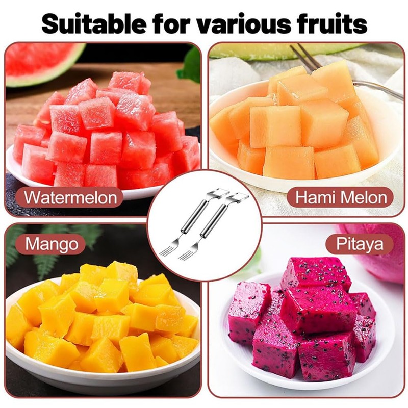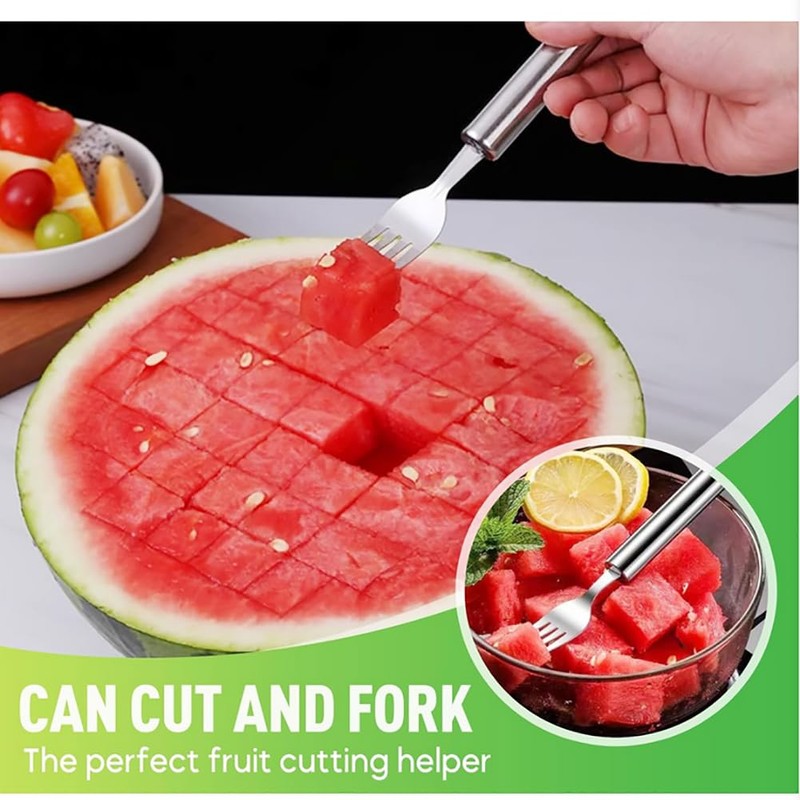 - 【2 in 1 Stainless Steel Fruit Cutter 】 Creative design, fork and cutter two in one. Simply push this watermelon slicer cutter tool into your watermelon and watch it effortlessly slice perfect squares. After cutting, use the fork end to easily lift and enjoy your delicious melon cubes.