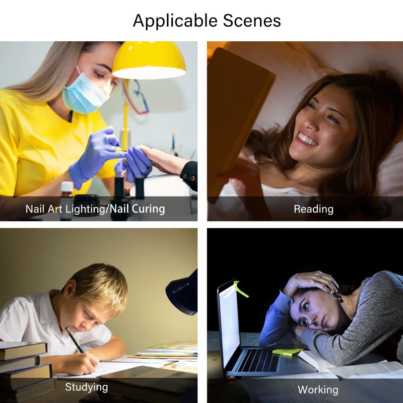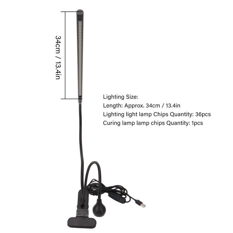 1、EYE PROTECTION: Our lightning lamp is composed of 36 lamp chips. LED light provides a uniform distribution of light, without glare, protecting the eyesight. 2、LIGHTING FUCTION: This nail lamp is equipped with a high powered LED light that emits a strong white light, making it an ideal design for makeup, tattoos, microstrips, manicures, cell phone repair, etc. 3、HEIGHT ANGLE ADJUSTABLE: The connection between the lamp head and the clamp is 2 metal hoses, 360° flexible enough to meet your needs at different placement angles. 4、MULTIPURPOSE LAMP: Each lighting mode has 10 brightness levels, suitable for nail lighting, nail curing, reading, studying, working, painting, study, dormitory, etc. 5、LEVELS ADJUSTABLE: In order to meet your different needs, this set is equipped with a switch, which means you can control the light level according to your different working needs.