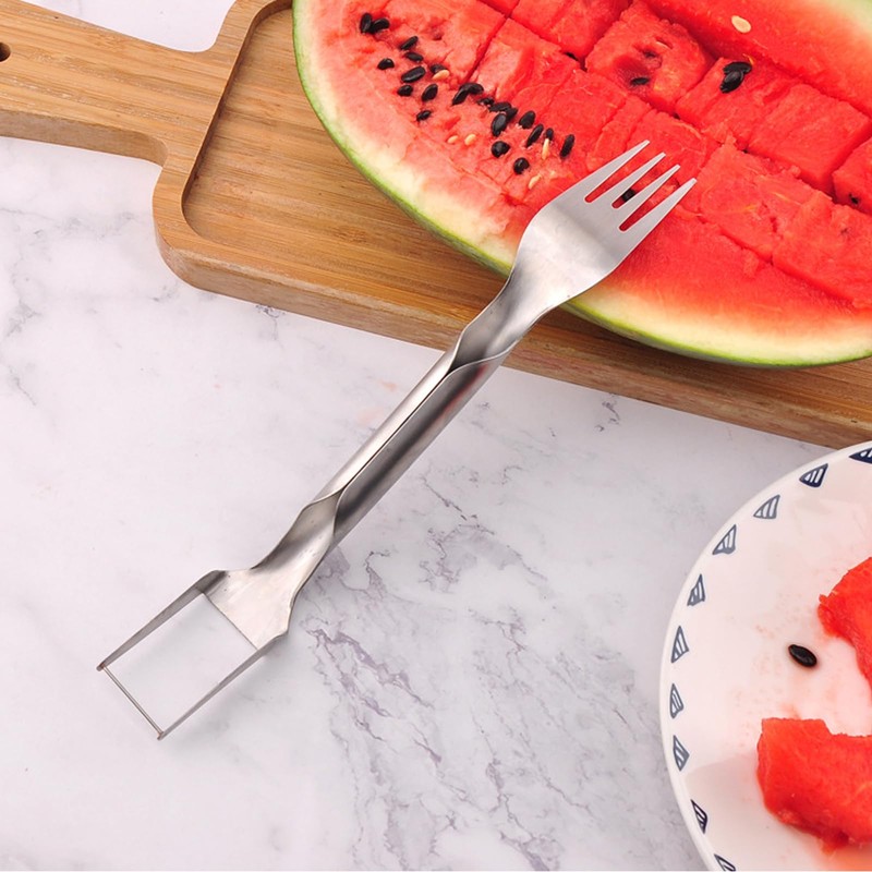 - 【Two-in-one stainless steel fruit cutter】This watermelon fork slicer adopts a two-in-one design, combining a fork and a slicer, so this two-in-one tool can be used as a watermelon knife to cut the watermelon into small cubes, or as a fork. With this watermelon slicer, you don't have to worry about watermelon juice spilling everywhere.