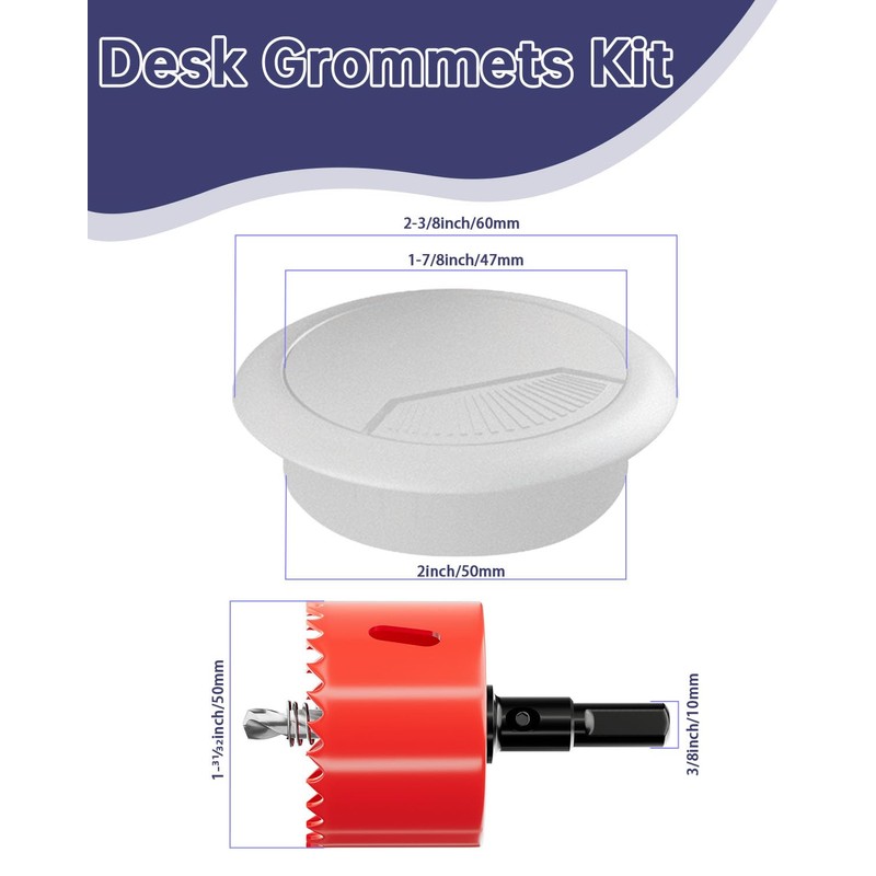 - Package Includes: 1 x 2 in. Hole Saw, 1 x Arbor and Pilot Bit, 1x Hex Key, 10 x 2 in. White Desk Grommet.