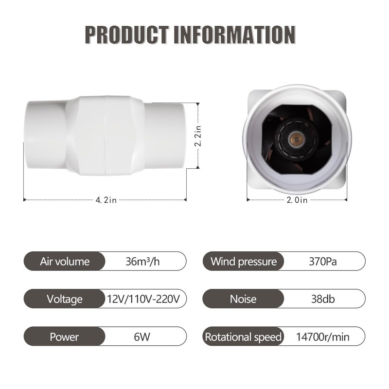 • ★【Low Noise】 -- This premium built inline fan designed to exhaust and intake air through 2" ducts in a quietest way possible. Sound pressure level at full speed is 38 DB only.