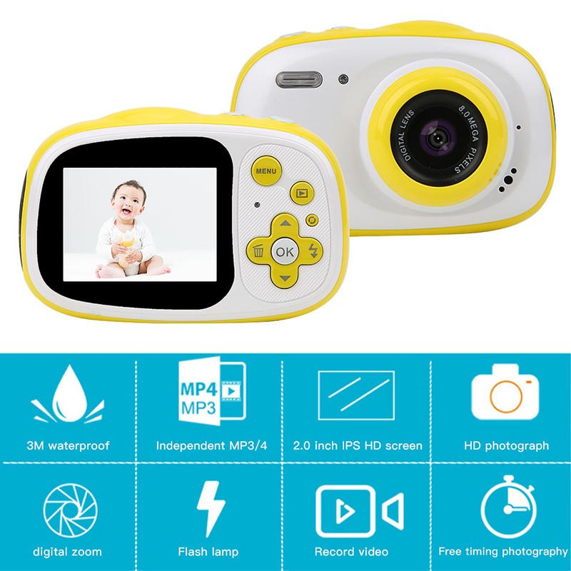 2 Inch IPS HD Display Screen 8MP Waterproof 6X Zoom Children Digital Camera Cute Gift(Yellow)