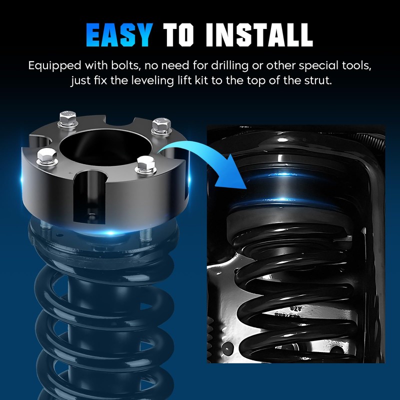 - 【Easy To Install】Equipped with bolts, no need for drilling or other special tools, just fix the leveling lift kit to the top of the strut.