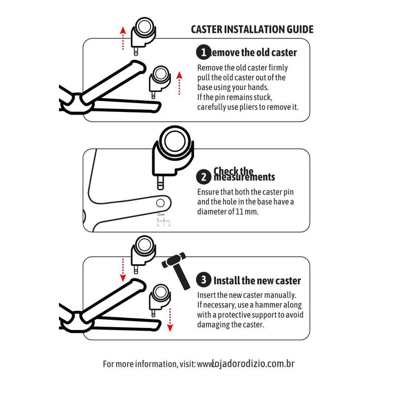 - 0.43in (11mm) STEM QUICK AND EASY INSTALLATION – No tools required! Replace your chair wheels in under 30 seconds. Just pull out the old casters and push in the new ones. Check out our quick replacement video for more details.