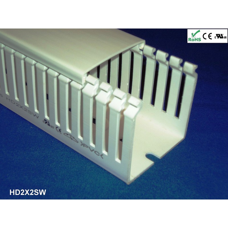 * Thin slot/finger design allows for more slots for higher density wiring such as terminals, etc. * Fingers are provided with predetermined break lines permitting enlarging slots without any tools required * cUL and CE certification * Made from RoHS compliant, high impact, self extinguishing, rigid PVC * Benefits of PVC material: high impact resistance, warp-proof, and self-extinguishing * Provided with mounting holes and recess bosses for mounting accessories * Restricted slot openings for better wire retention * Non-slip, snap on/off cover design provides tight grip to prevent vibration slippage * Great for control panels or for concealing and routing wires in all sorts of applications * All wiring ducts come complete with covers
