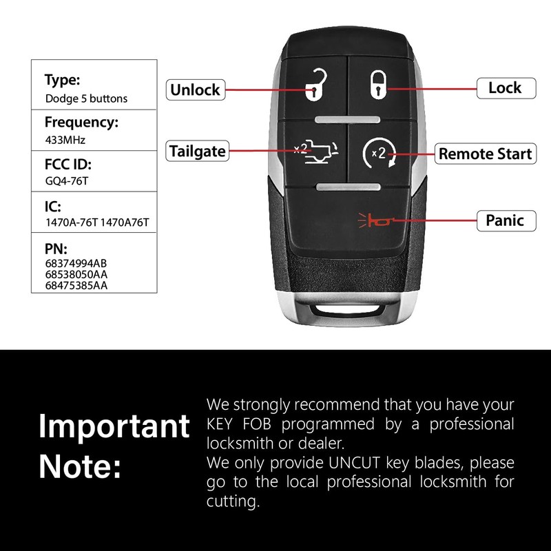 - Compatible Vehicles: Part Number: 68374994AB FCC ID: GQ4-76T. Replacement for 2019 - 2023 Dodge. For full complete list, please check our product description