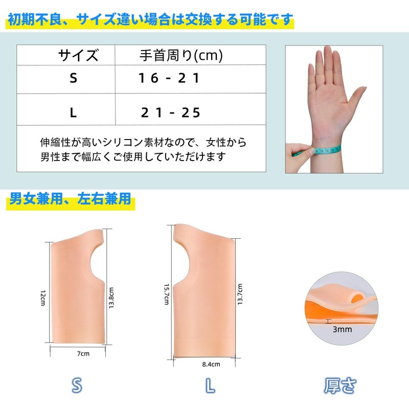 - 【サイズ】適応手首周り:Sサイズ:16cm~21cm、 Lサイズ:21cm~25cm。手首サポーターは伸縮性が高い素材なので、 女性から男性まで幅広くご使用していただけます。【注意】シリコンアレルギーの方は本製品をご使用時間を個人の状況などによりを控え、または使用を中止して下さい。
