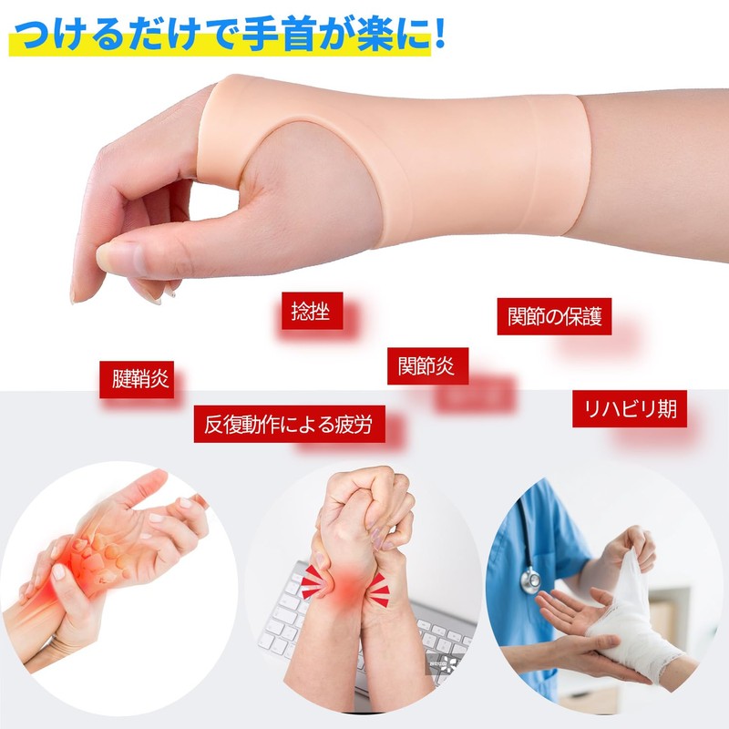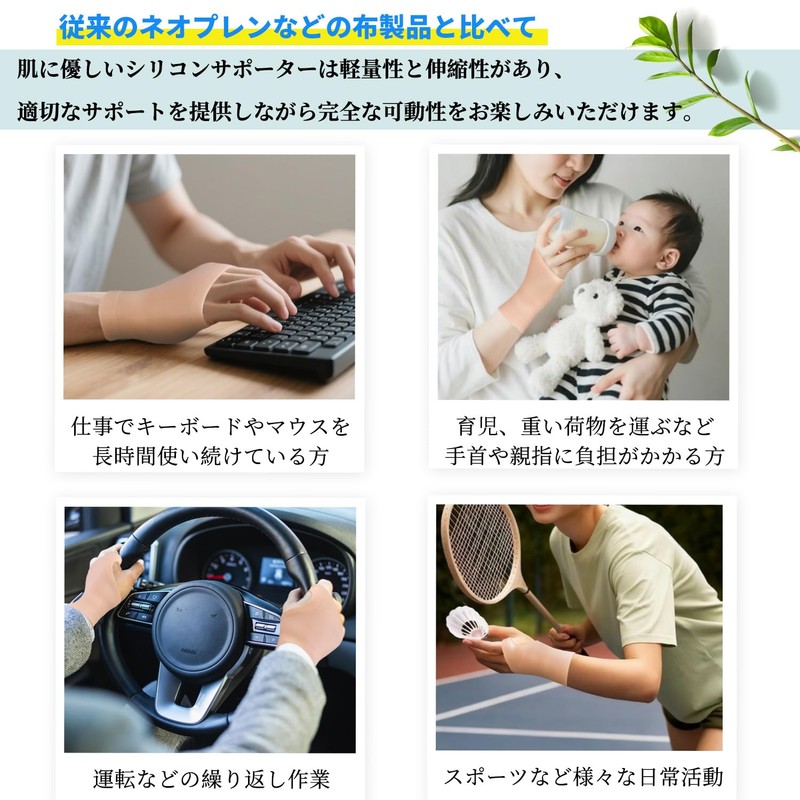 - 【適用人群】仕事でキーボードやマウスを長時間使い続けている方。家事、育児など、手を使ったり重いものを長時間持っていると、手首や親指に負担がかかる方。手首サポーターをスポーツで装着すれば、疲労感や張りを簡単にケアすることができます。重い荷物を運ぶときに手首にかかる負担を減らせケガをしにくくなります。