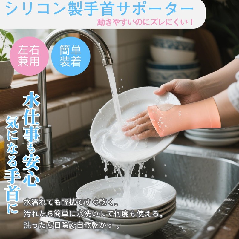 - 【水仕事可能】手首サポーターは水に濡れても良いシリコン素材なので、軽く拭くだけで速やかに乾燥します。そのため、水仕事中も装着可能で、日常使いに最適です。汚れた場合は、簡単に水洗いを行い、何度でも繰り返し使用可能です。洗浄後は、日陰で自然乾燥させてください。