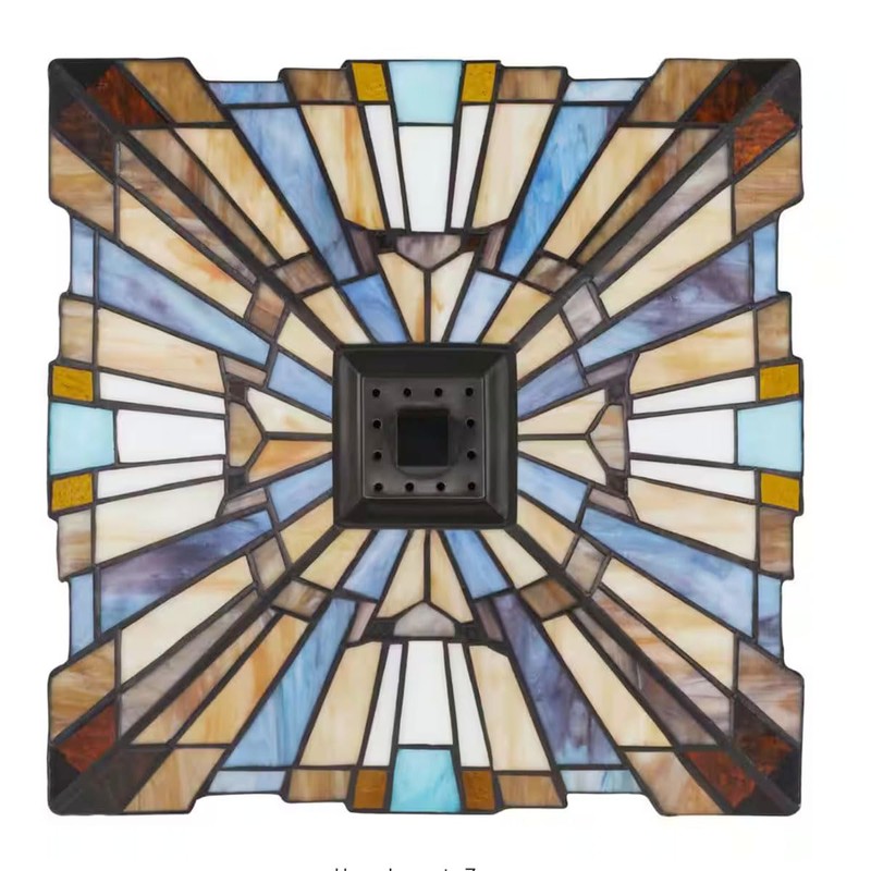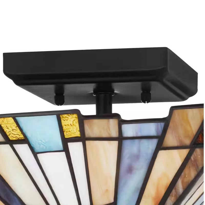 The geometric design of this two-light semi-flush mount fixture stands out in any home. Crafted with a durable steel frame and a sophisticated matte black finish, this piece features a handcrafted Tiffany glass shade in earth tones such as warm honey amber, cream, emerald green, and sapphire blue. Each glass piece is carefully hand-assembled to form a unique and elegant pattern that complements both traditional and transitional interiors. Ideal for entryways, hallways, bedrooms, or living rooms, this fixture is also compatible with dimmer switches and damp-rated areas, offering functionality without compromising on style.