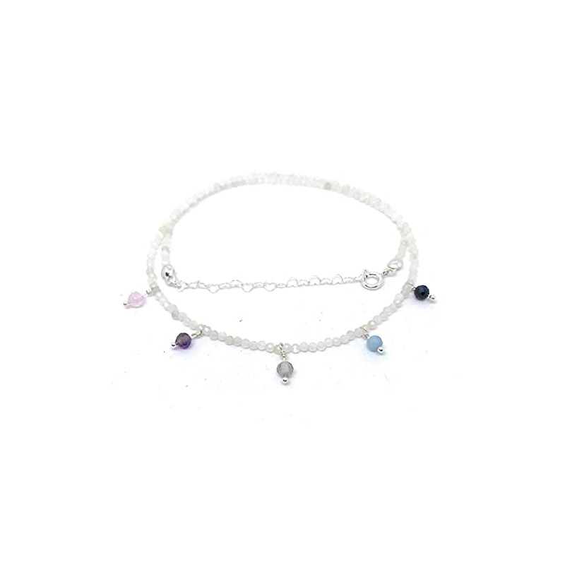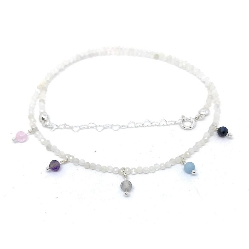 2 mm thick natural moonstone choker with small pendants in 925 sterling silver, length 40 cm and heart chain up to 45 cm
