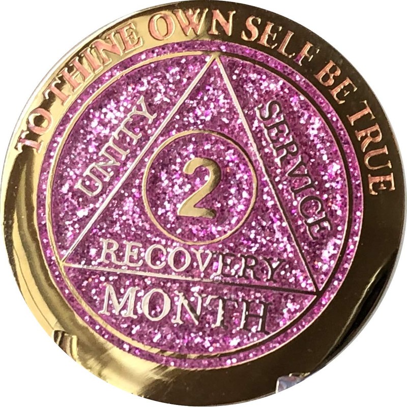 2 Month AA Medallion In Reflex Pink Glitter Color. Bi-Plated With Glossy Gold and Silver Plating. Extra Thick Sobriety Chip for Premium Weight And Feel. 33mm x 3mm vs standard 2mm. Serenity Prayer Back. Comes With A Protective vinyl envelope. Great way to celebrate 60 days of sobriety.