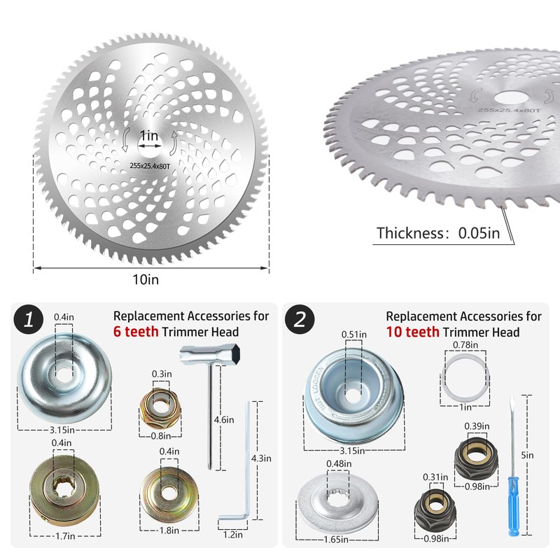 - 【Notes on Use】We strongly recommend wearing boots or at least ankle length shoes and jeans. Tree and rock debris may bounce off your legs. Safety glasses or goggles must be worn. If you have any questions about brush cutter blade, please contact our customer service, we will provide the perfect solution.