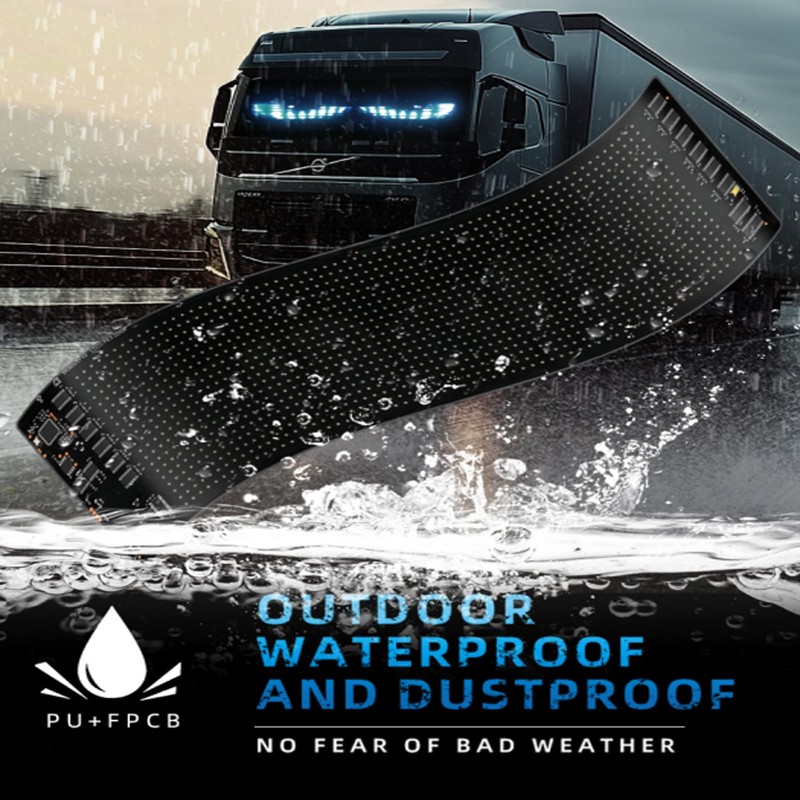 - Weatherproof LED Matrix Display - UV-resistant coating prevents fading, while flexible 2mm LED panels withstand rain, snow, and vibrations. Program snowflakes, lasers, or rotating fonts via app. Ideal for long-haul trucks, food trucks, and outdoor events – attach to windows/mirrors with tape.
