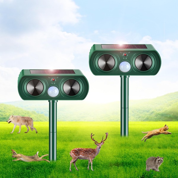 - Smart Sensing & Dual Deterrent Defense:Equipped with an advanced PIR motion sensor and ultrasonic speaker, this device detects movement within a 110° range and up to 33 feet. Once triggered, it emits powerful ultrasonic waves and flashing red lights to effectively scare off deer, cats, dogs, squirrels, and other intruders