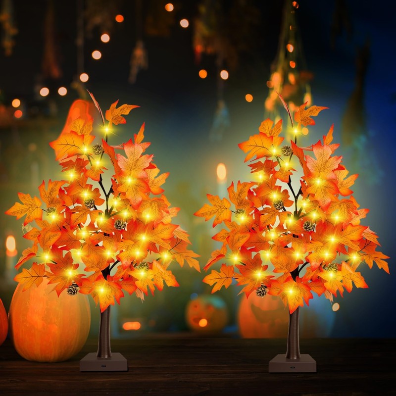 2 Pack 24 Inch Fall Decor Maple Tree - 2FT Lighted Fall Tree with 36 LED Ligh...