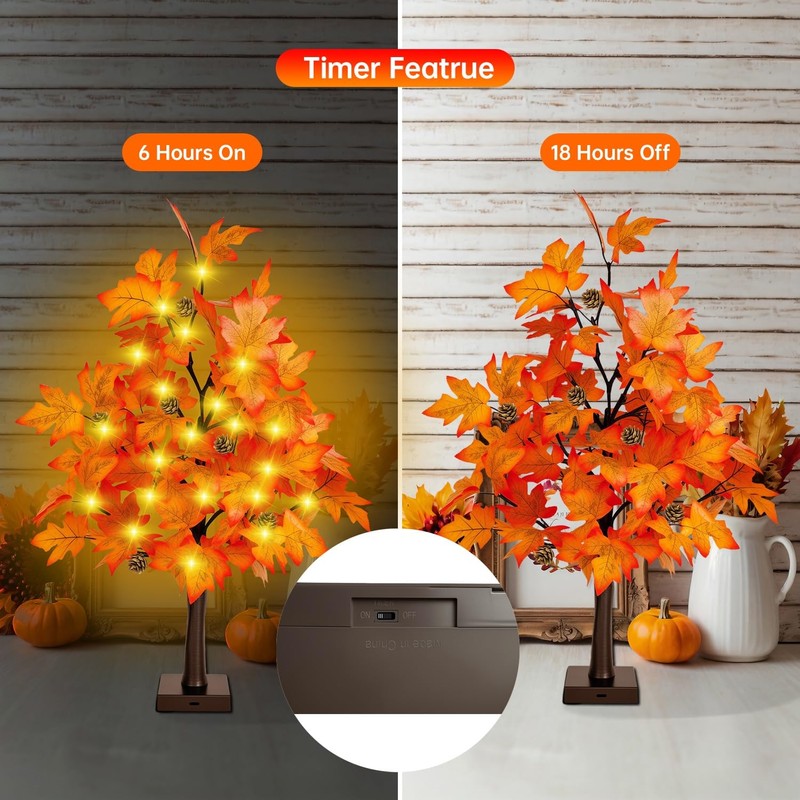 • 【Fall Decor Home Tabletop Fall Trees Lights】24 Inch lighted maple tree. Each Fall tree has total 36 branches, 36 led bulbs, 6 pines and 72 maple leaves. Note: please unfold and fluff the branches to achieve desired fullness.