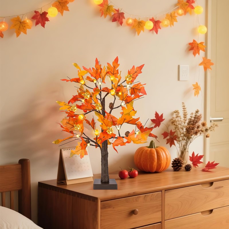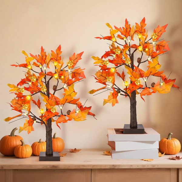 - 【Fall Decor】 Package include 2 Pack 24 Inch lighted fall tree with Realistic Trunk and Lifelike Foliage, Hand-Arranged Leaves with Flexible TPE Material for Natural Softness. Reinforced Bark-Textured Trunk That Mimics Real Maple Trees, Integrated Warm White LED Lights cast a soft ambient glow through the fall leaves, enhancing the rich reds and golds of your fall and Thanksgiving decor with just the right luminosity