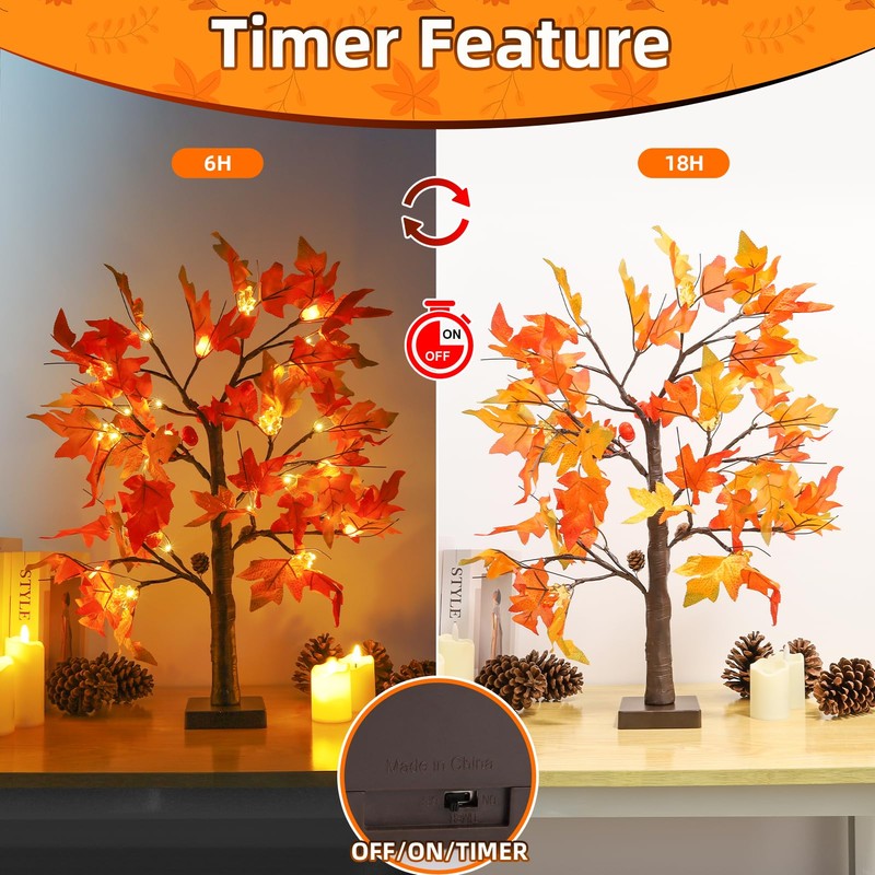 - 【Battery Operated & Timer】 Each fall maple tree lighted are powered by 3 AA batteries (not included), built-in Smart Timer Mode: Energy-saving auto-scheduling activates/deactivates lights daily (6hrs ON / 18hrs OFF). This pre-lit maple tree infuses any space with warm harvest energy—from cozy Thanksgiving dinners to festive fall parties. Its gentle glow elevates fall home decor instantly