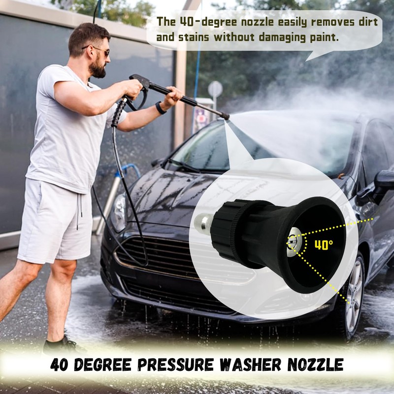 - 40 Degree pressure washer nozzle: The 40 degree pressure washer nozzle creates a large coverage area with a relatively even flow of water.The 4.0 orifice sprays a fan-shaped stream of water, which quickly rinses away dirt, mud and stains from the surface of the car body and improves the efficiency of the car wash!