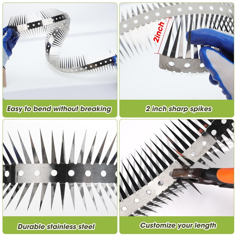 - 【Effective Bird Scare Devices】:The sharp tips anti bird spikes effectively deter birds such as pigeons, sparrows, house swallows, mockingbirds, seagulls, and more, preventing them from perching, roosting, loitering, or nesting, thus resolving issues related to bird presence and droppings. Our bird spikes also act as a barrier to prevent raccoons, skunks, snakes, cats, foxes, and other critters from climbing fences, entering homes, or accessing outdoor feeders.