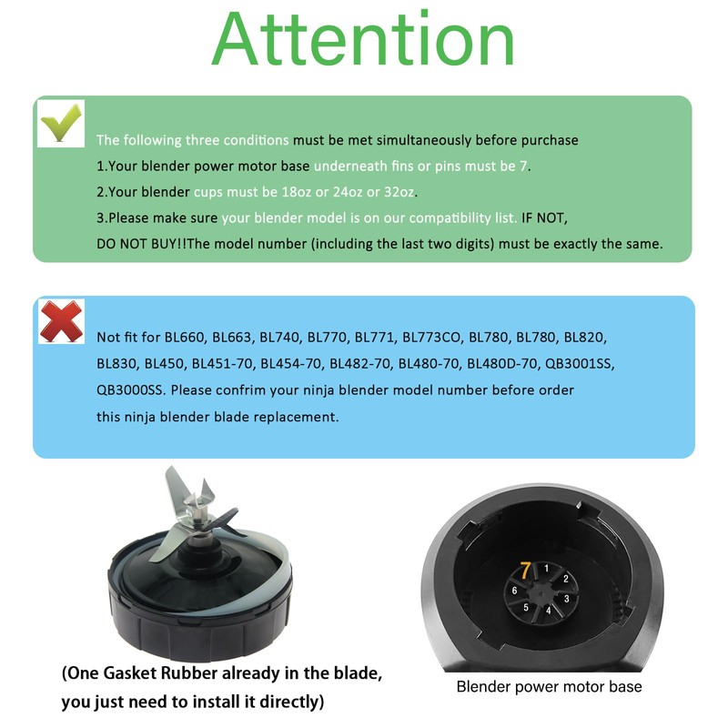 • 【Pro Tips】① Please carefully review all product images to confirm compatibility before purchase. ② Ensure your blender model is listed in our compatibility list - the model number (including the last two digits) must match exactly. ③ Your Ninja blender must have 7 fins (not 5 or 6 fins). ④ Your Ninja blender cup capacity should be 18oz, 24oz or 32oz (not 16oz). ⑤ A rubber gasket comes pre-installed in the blade assembly; simply install it directly.