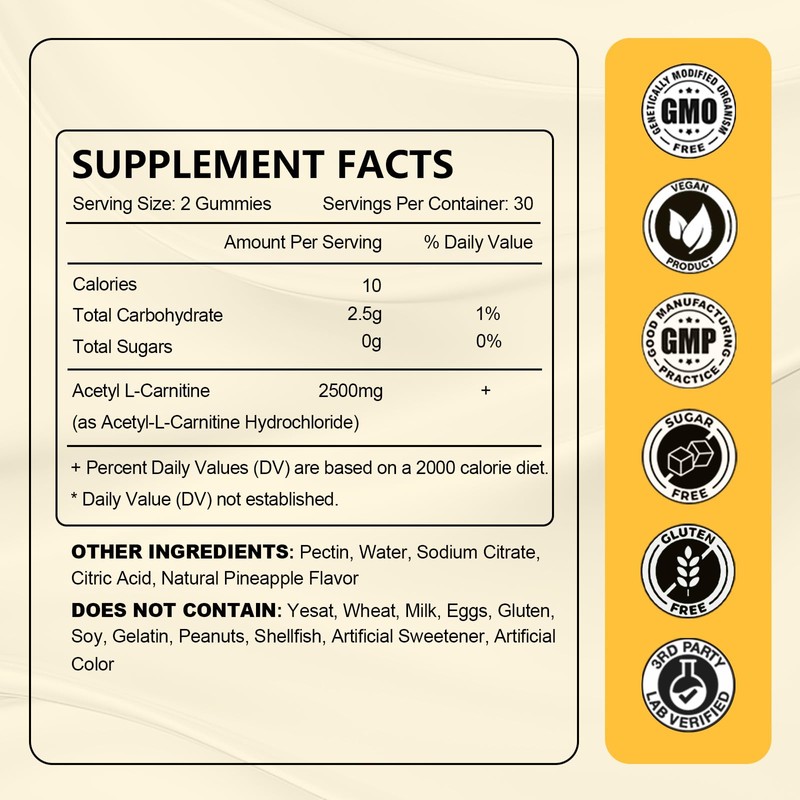 - 【Works for Women & Men】Our acetyl L-carnitine supplement gummies provide a convenient way to support your health. Formulated to enhance focus, memory, and energy levels, these gummies are suitable for both women and men who seek to boost their brainpower. Product with a natural pineapple flavor are gentle on the stomach and easy to incorporate into routines, which provide you with all-around protection