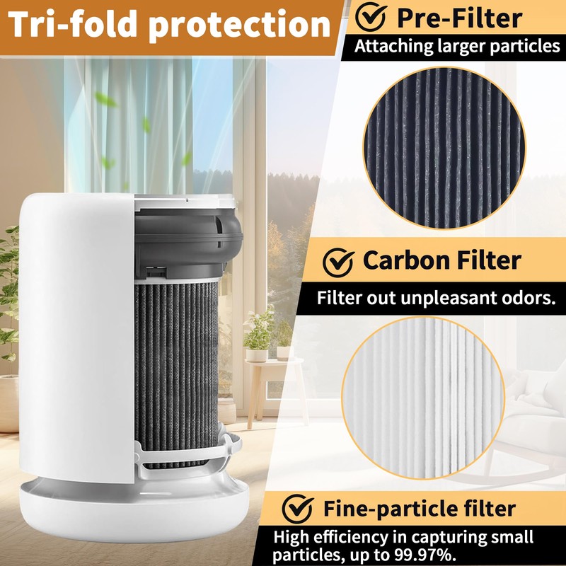 - 【Three-Stage High-Efficiency Filtration System】: The Air Mini PECO filter features a three-stage high-efficiency filtration system. The first layer is a non-woven pre-filter that removes larger particles such as dust, hair, pet fur, and lint. The second layer is an activated carbon layer that removes common household odors. Finally, the advanced fine-particle filter, with up to 99.97% efficiency, effectively removes airborne particles like dust, pollen, and other fine impurities