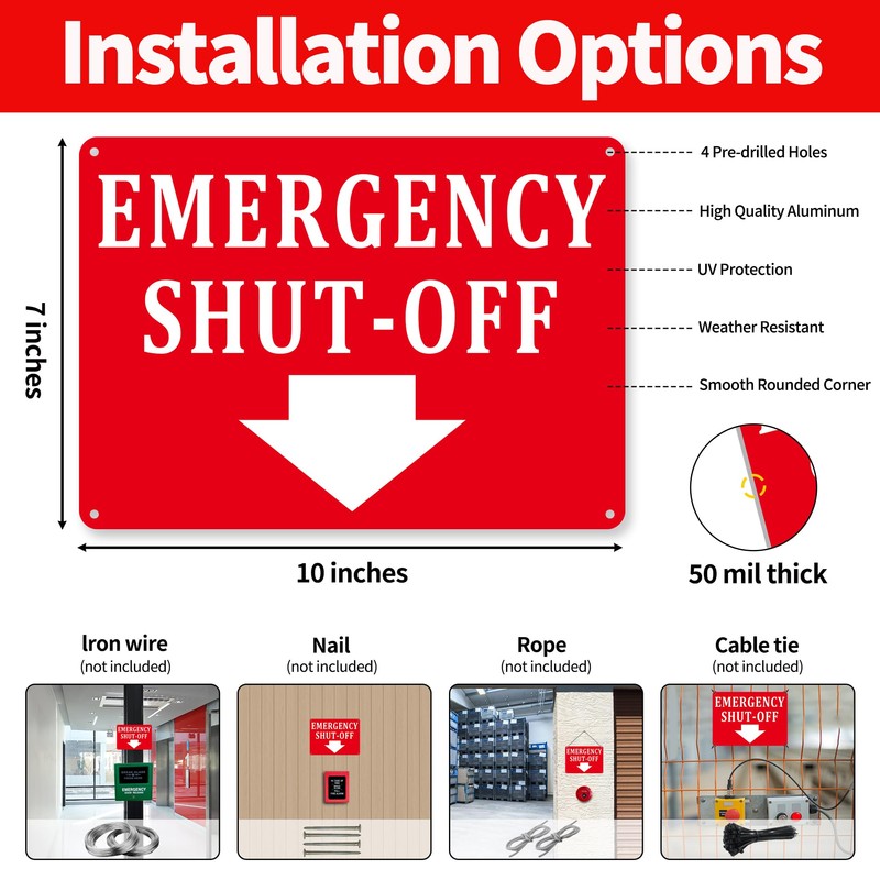 - 5. Easy to Install: Our emergency shut-off signs are extremely easy to install with four holes, making the emergency shut-off signs easy to install and ensuring it stays securely in place without easily falling off. You can use nails, cable ties or rope to install, easy to operate.