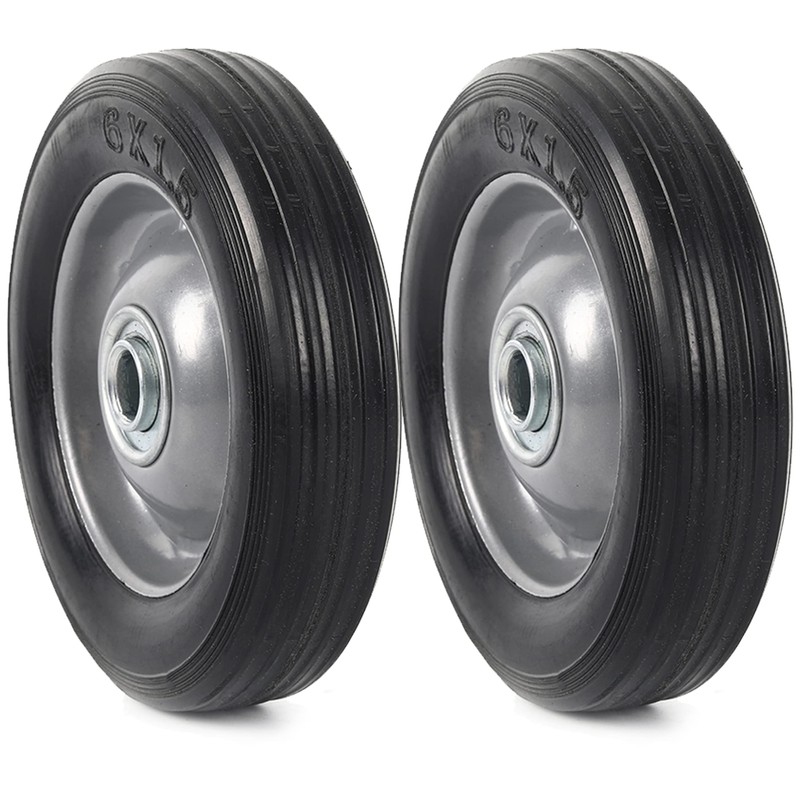 • AR-PRO 6” X 1.5” FLAT FREE SOLID RUBBER WHEEL ASSEMBLIES - These sets of flat-free wheel assemblies have nominal dimensions of 6 inches (outer diameter) and 1.5 inches (width). The actual dimensions are 6.14 inches outer diameter, 1.45 inches overall width, 3.9 inches rim diameter, and 1.5 inches tread width.