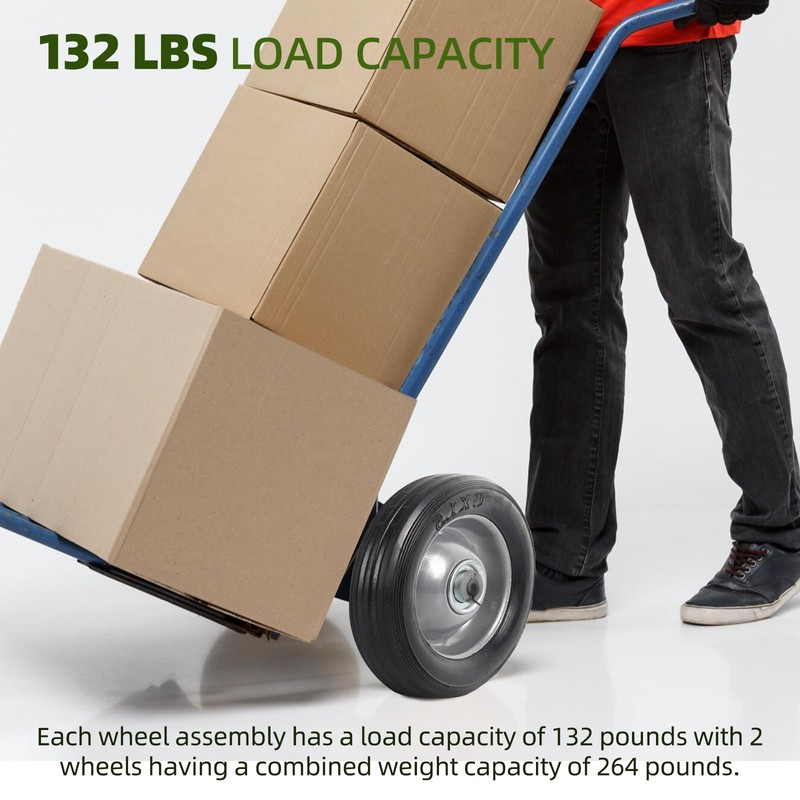 • 132 LBS LOAD CAPACITY - Each wheel assembly has a load capacity of 132 pounds with 2 wheels having a combined weight capacity of 264 pounds. This makes the flat-free solid rubber wheels perfect for both home and commercial use, especially on workhorse hand trucks and garden carts.